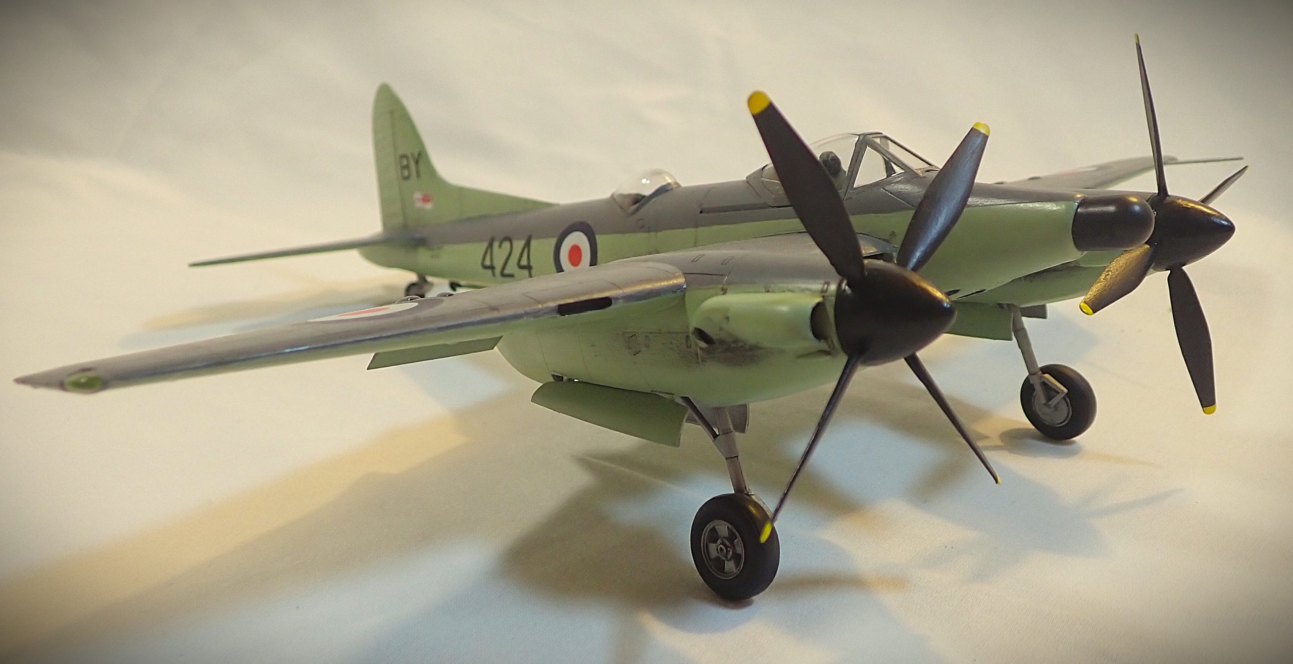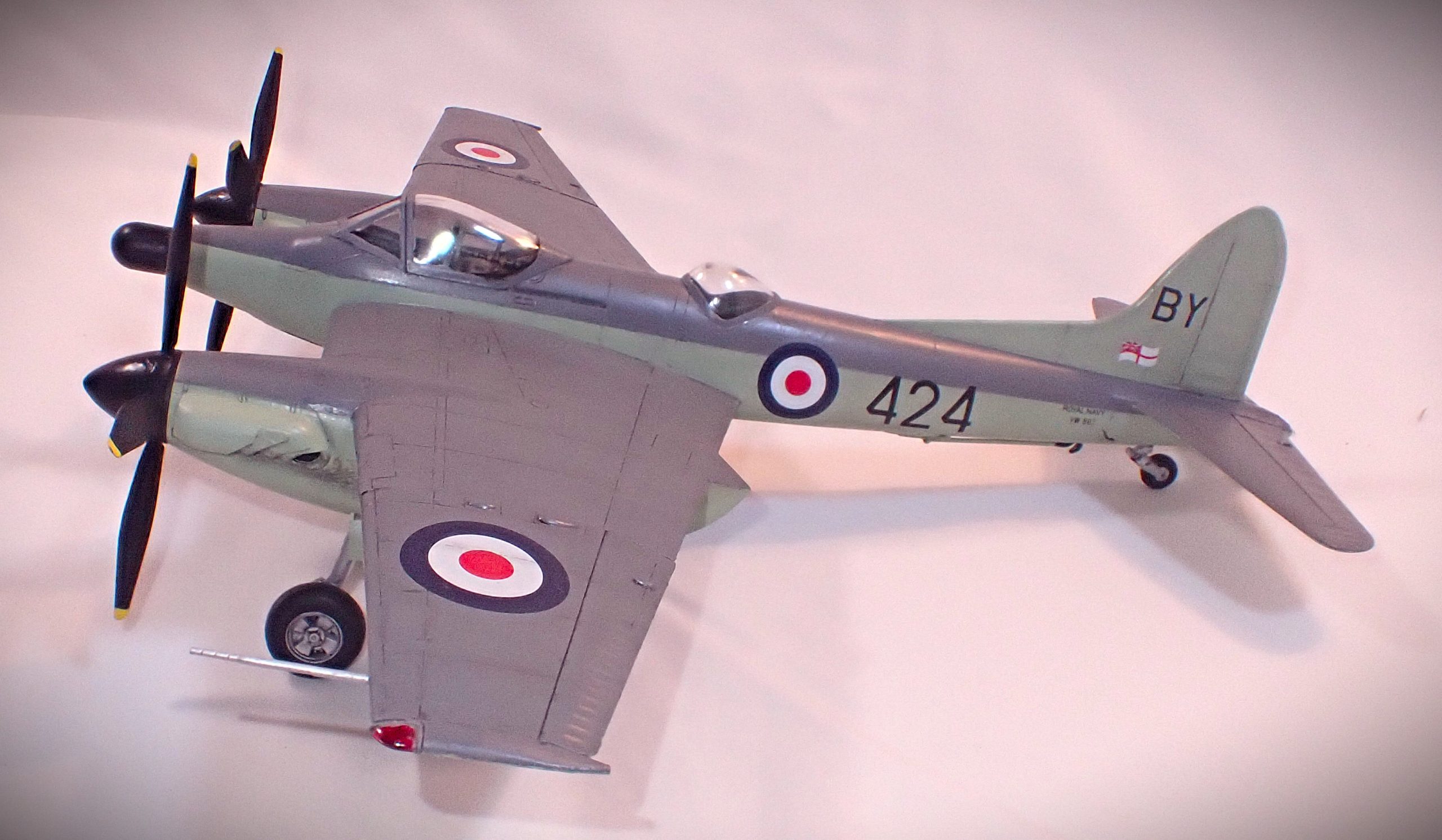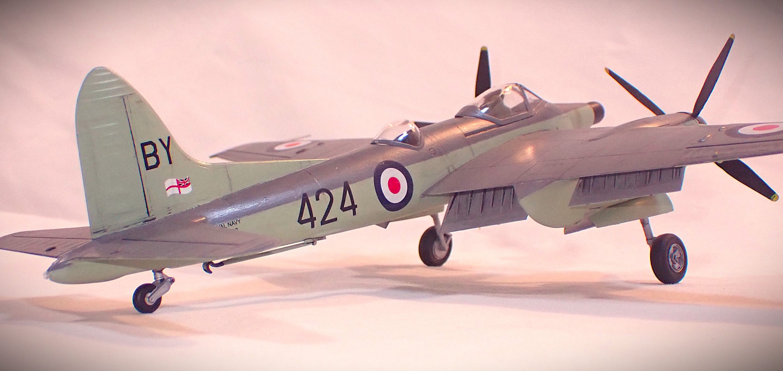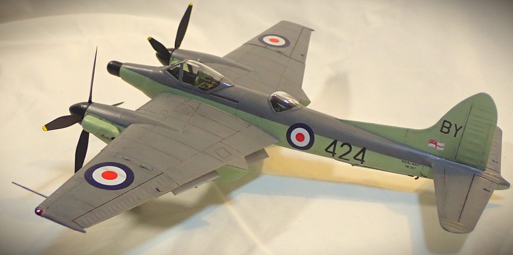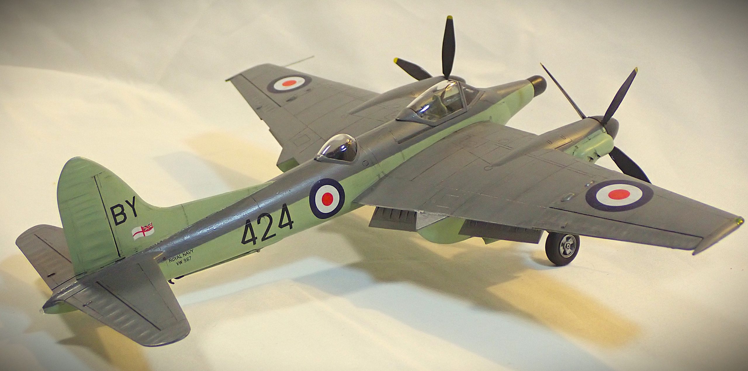 I chose to make the de Havilland Sea Hornet NF.21, VW967 424 of 809 NAS aboard HMS Vengeance in 1951. The aircraft is painted in the Dark Sea Grey upper with Sky lower colour scheme adopted by the FAA after the war. Cockpit green was still used for this type before the interior black of the jets.