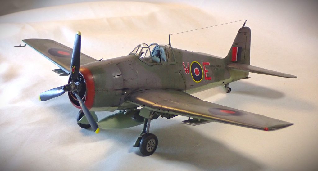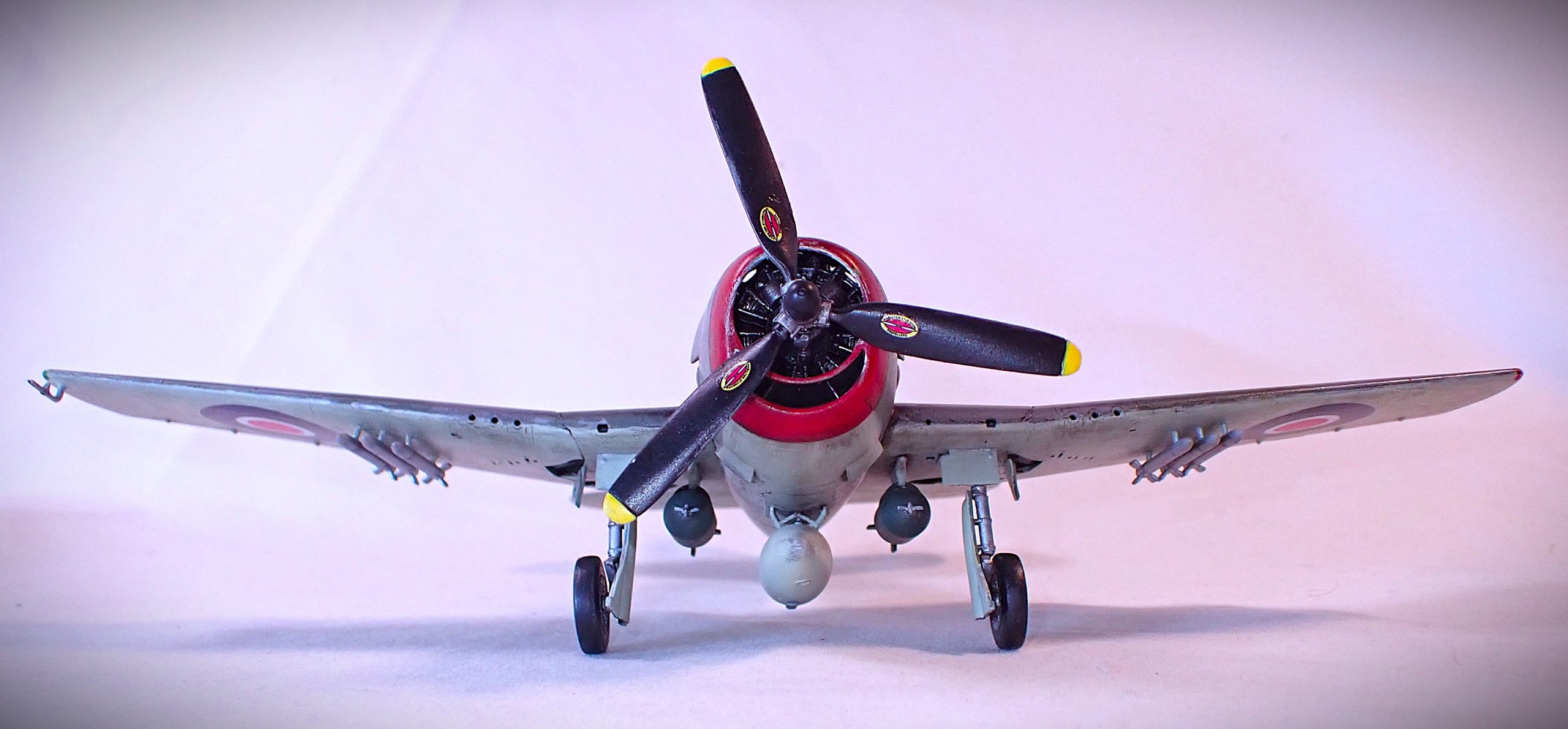 The Hellcat F Mk.II commenced delivery from May 1944 until the end of the war. The improved version had the more powerful Pratt & Witney R-2800-10W giving 2200hp. A small number were equipped with cameras and used as photo-reconnaissance roles with the designation Hellcat FR Mk.II. In the Med and Atlantic the FAA Hellcats were faced with land based enemy aircraft so did not get as much opportunity as their RAF counterparts. The Pacific theatre gave more opportunity for dogfights. Indeed, 1844 NAS of the BPF on HMS Indomitable was the highest scoring Hellcat unit with 32.5 kills.
