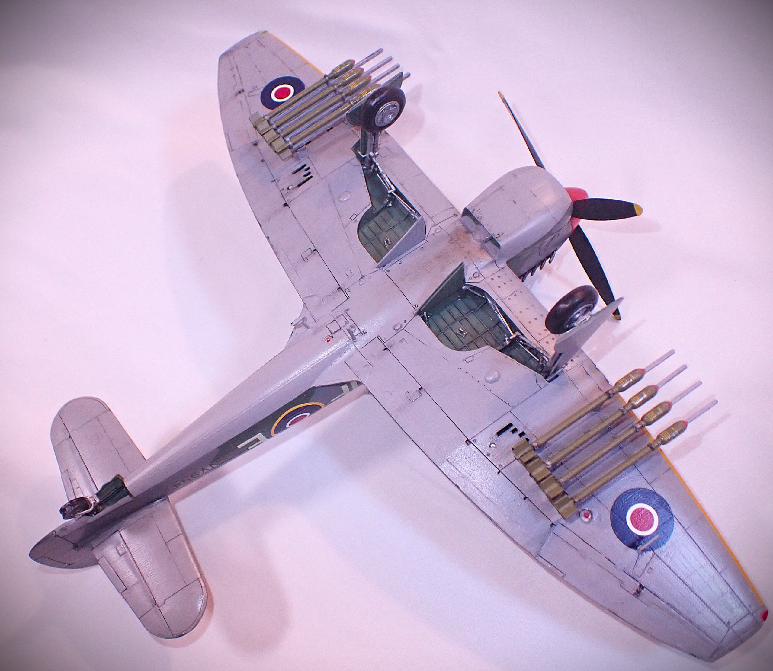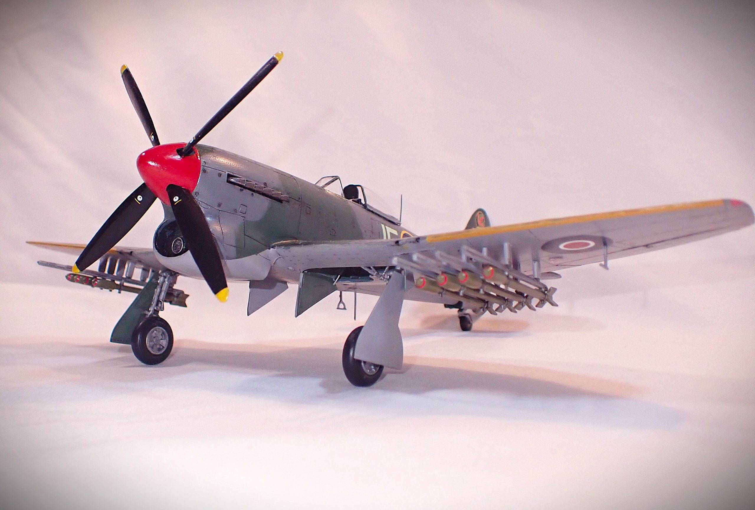 The Hawker Tempest was designed by Sydney Camm from the Hawker Typhoon to fix the disappointing issues realised with the earlier fighter. There were relatively few changes, but the result was a new, more powerful aircraft capable of more than the Typhoon. The main issue was the thick wing which produced too much drag with increased speed in the Typhoon. The wing was redesigned to be 5 inches thinner at the root and a more elliptical shape making the aircraft faster. However, the thinner wing meant little room for fuel tanks, so it had to be fitted with an internal fuel tank in the fuselage, pushing the engine forward, elongating the fuselage and increasing the elevator and rudder surfaces in the tail. The undercarriage was also rebuilt therefore making it a totally different aircraft. Hence the renaming to Tempest, following Hawker’s theme of naming fighters after winds.