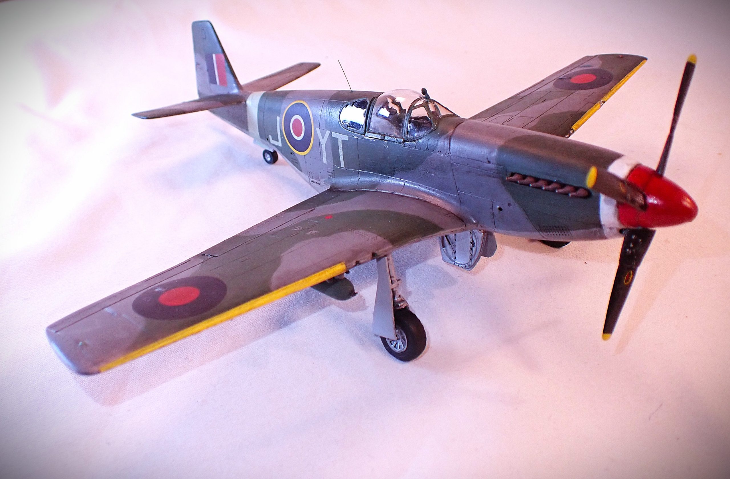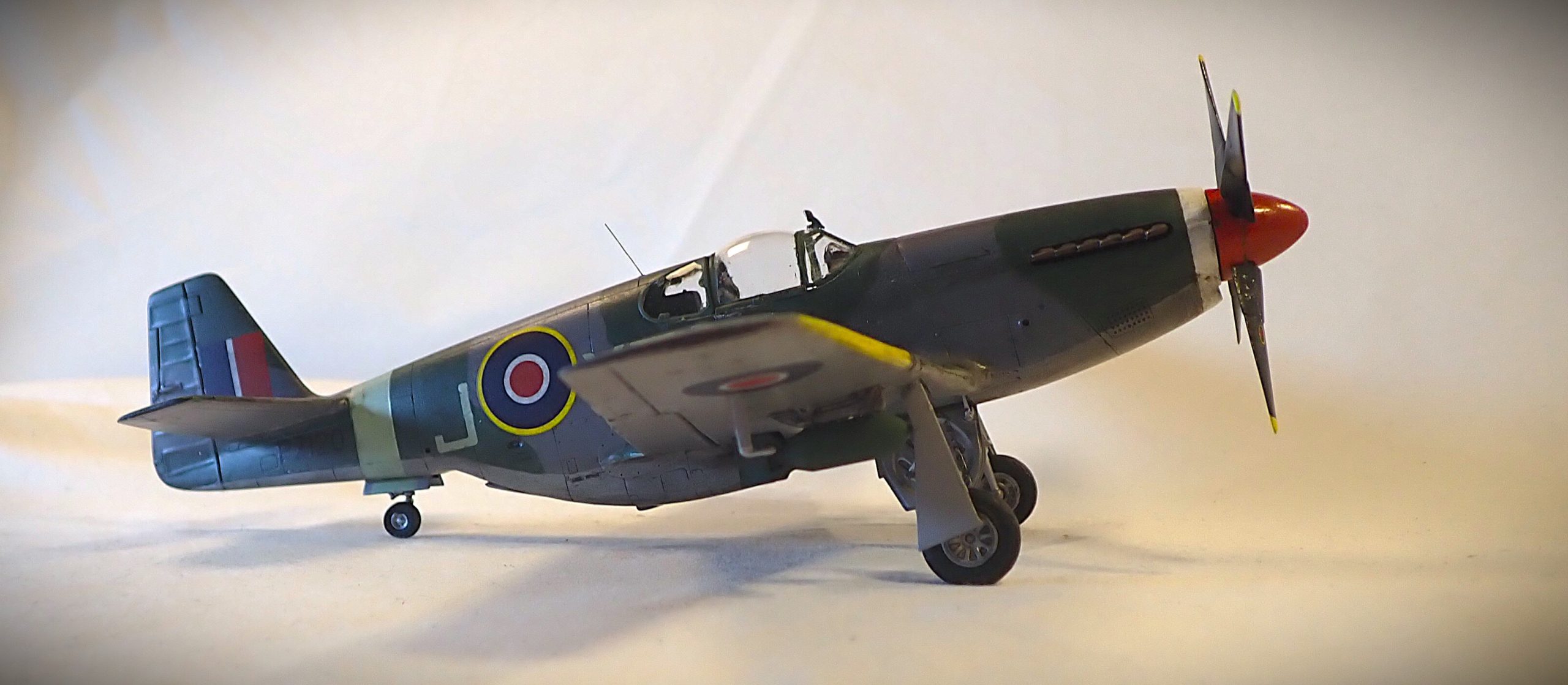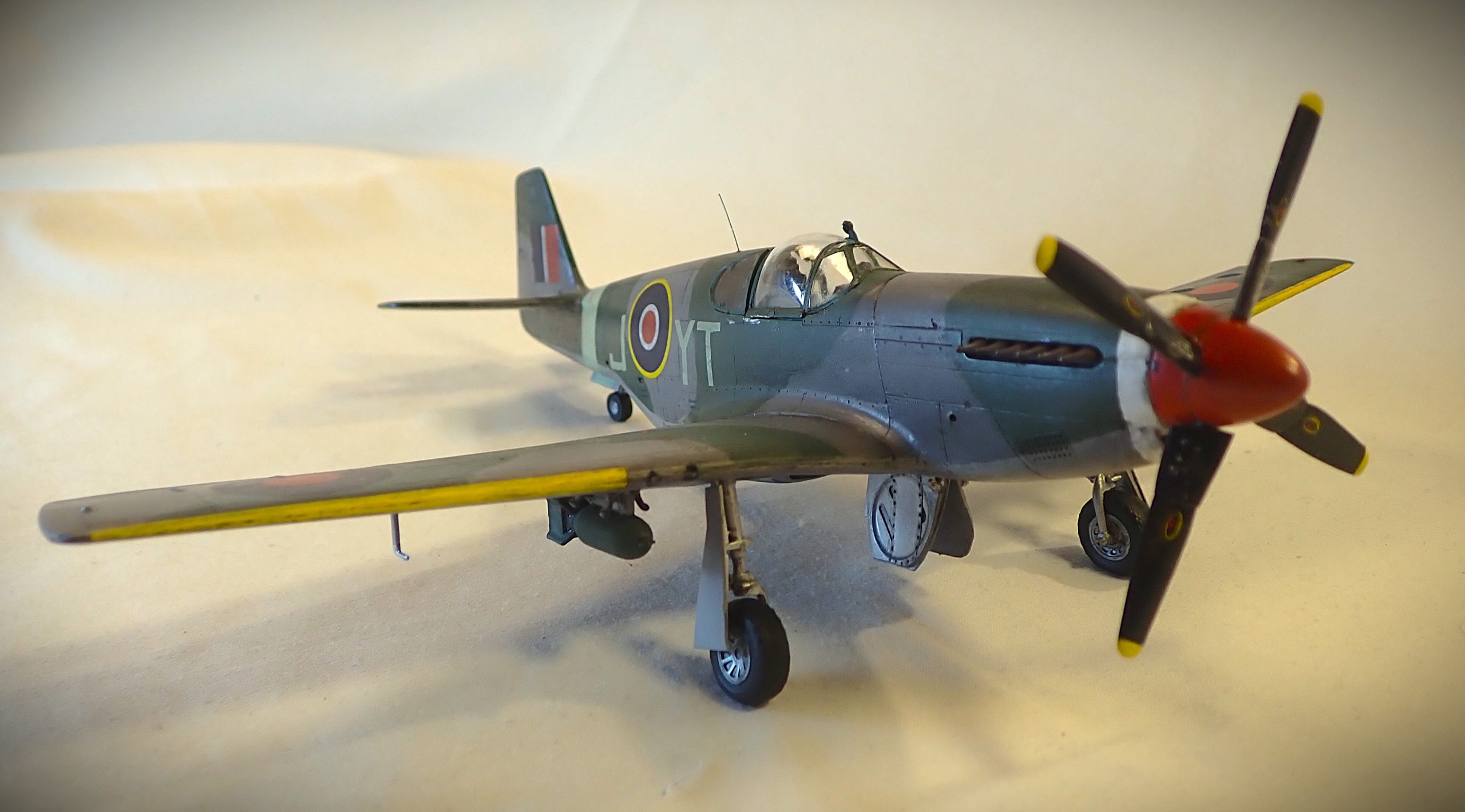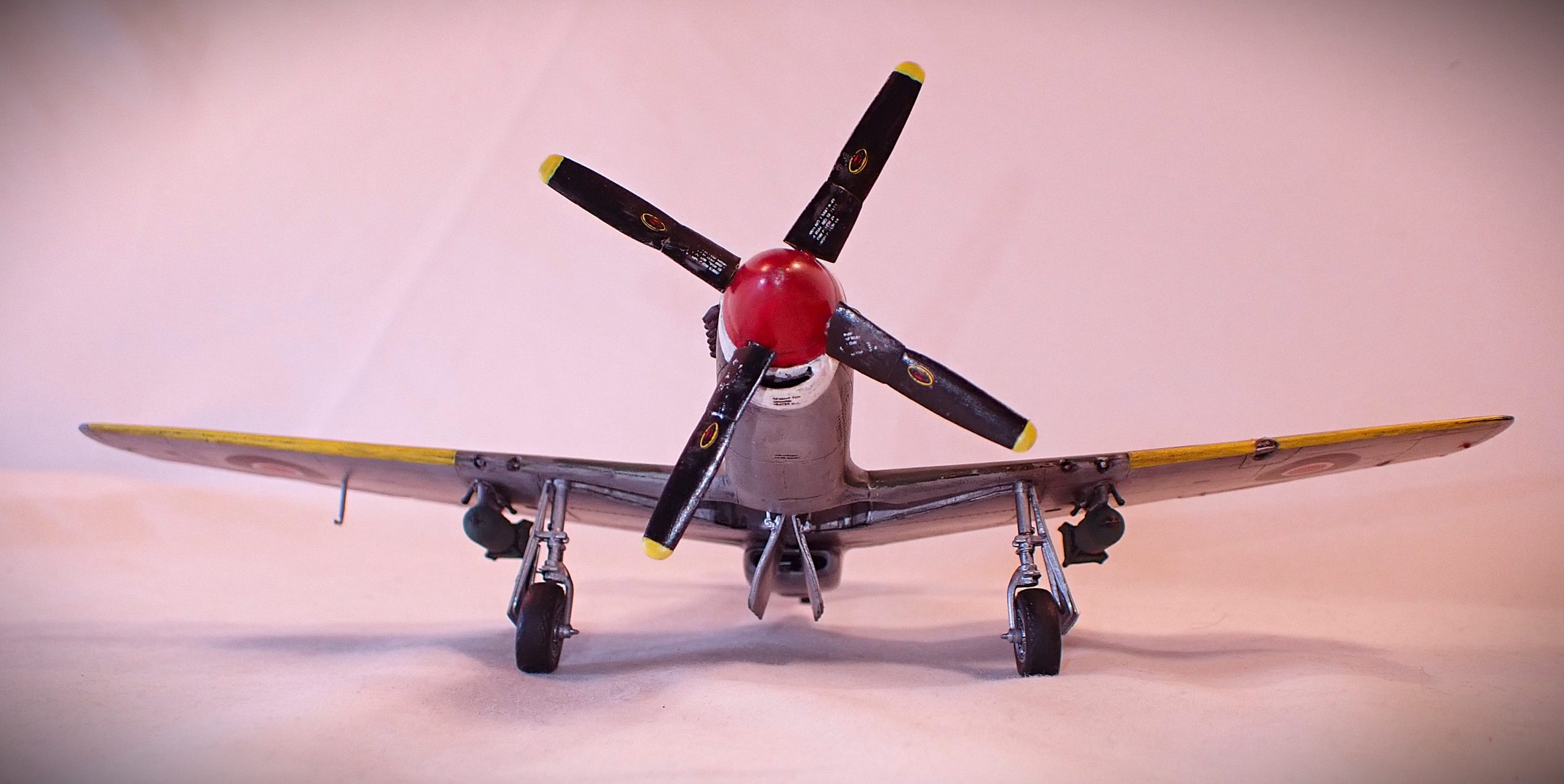 In May 1942 a project called the Mustang X came into being with experiments to fit a Rolls-Royce Merlin 61 to the Mustang airframe. In the end the Merlin 65 series was used with two speed supercharger giving increases in altitude and speed. Tests were completed by October and proved that the performance was substantially better with operational ceiling way above that of the Allison. A contract was issued for Packard to replicate the Merlin in the V-1650-3 engine. Two NAA Merlin prototypes were ordered and became known as the XP-51B with a top speed of 441mph and service ceiling of 42,000 ft. The centre of gravity was affected with the heavier engine and slightly longer forward section, so the wings were moved forward. This also allowed for a central fuel tank to be fitted behind the cockpit vastly improving range. The carburettor intake was moved to below the nose with the four .50 Browning being retained. Hard points allowed for external bombs up to 2,000lb or 8 rockets or drop tanks depending on the type of mission.