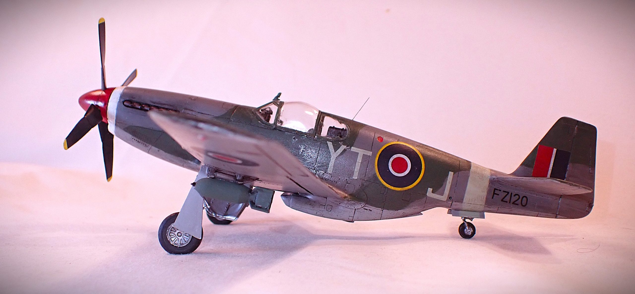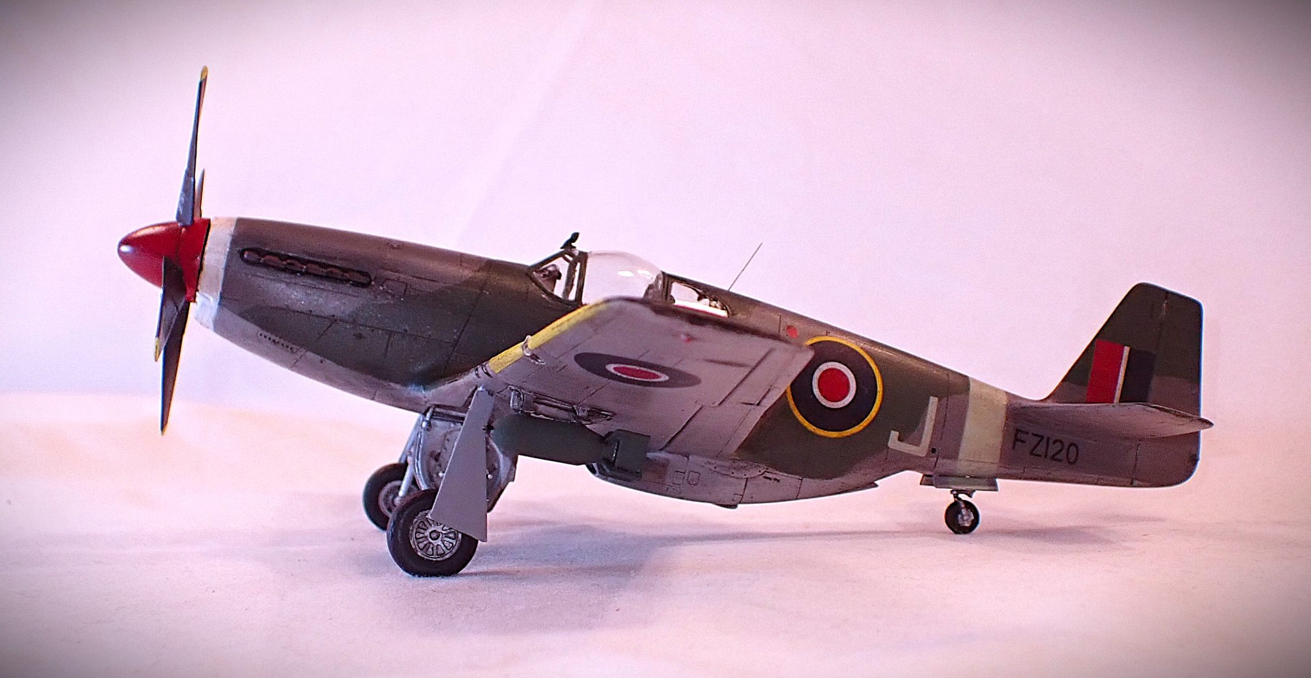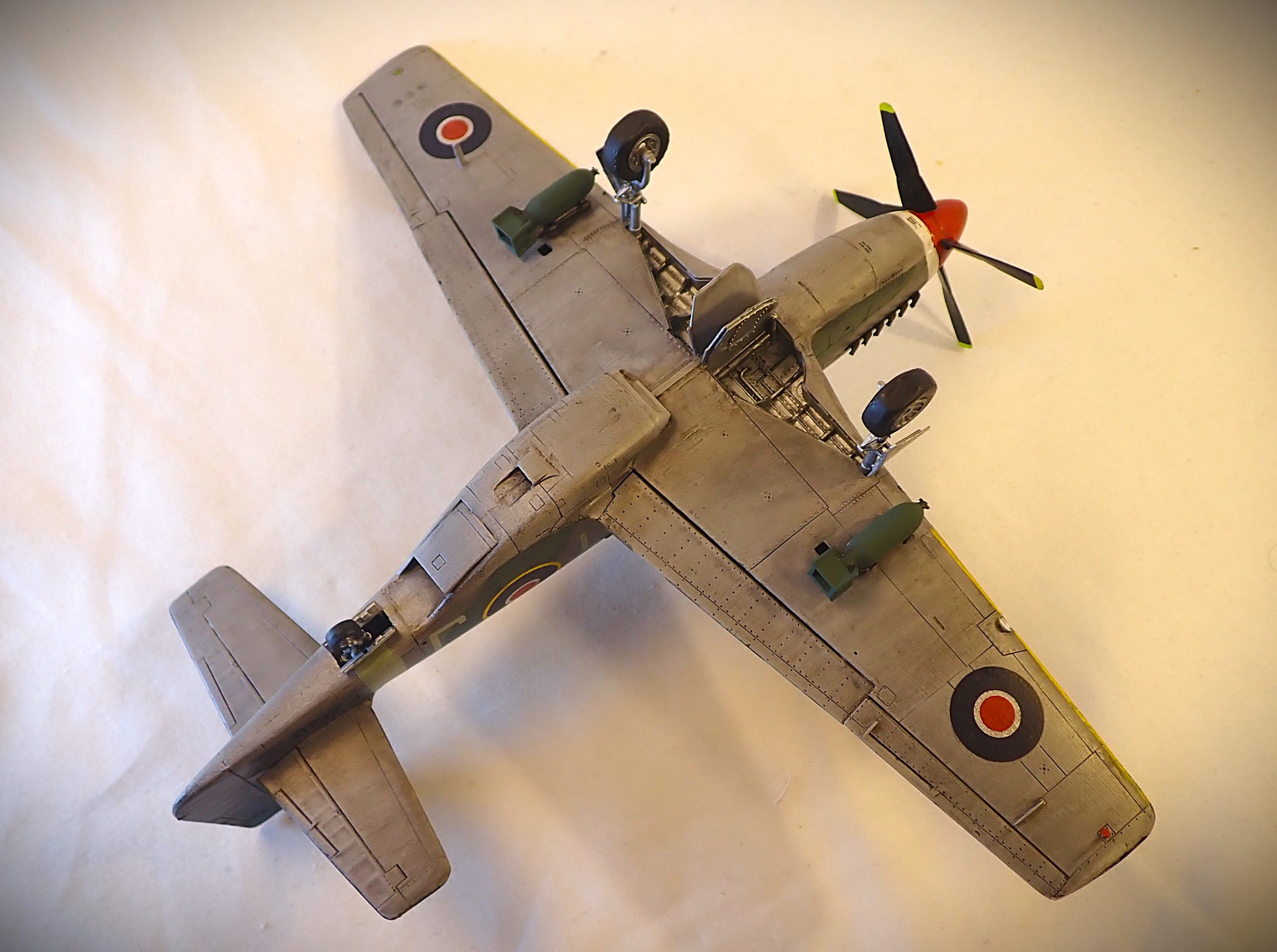 In May 1942 a project called the Mustang X came into being with experiments to fit a Rolls-Royce Merlin 61 to the Mustang airframe. In the end the Merlin 65 series was used with two speed supercharger giving increases in altitude and speed. Tests were completed by October and proved that the performance was substantially better with operational ceiling way above that of the Allison. A contract was issued for Packard to replicate the Merlin in the V-1650-3 engine. Two NAA Merlin prototypes were ordered and became known as the XP-51B with a top speed of 441mph and service ceiling of 42,000 ft. The centre of gravity was affected with the heavier engine and slightly longer forward section, so the wings were moved forward. This also allowed for a central fuel tank to be fitted behind the cockpit vastly improving range. The carburettor intake was moved to below the nose with the four .50 Browning being retained. Hard points allowed for external bombs up to 2,000lb or 8 rockets or drop tanks depending on the type of mission.